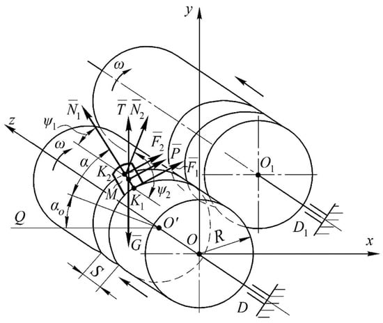 - are the normal reactions of the adjacent helices of the spiral, at the contact points K1 and K2, respectively. They are directed, respectively, at angles ψ1 and ψ2 to axis Oz and are located in a plane, parallel to plane zOy;