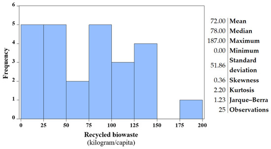 The histogram of the recycled biowaste in the EU-28, with the exception of Ireland, Greece and Cyprus, due to data unavailability. Descriptive statistics, year 2018. Source: Authors’ own results (raw data source: Eurostat [53], processed in EViews 10 Student Version Lite).