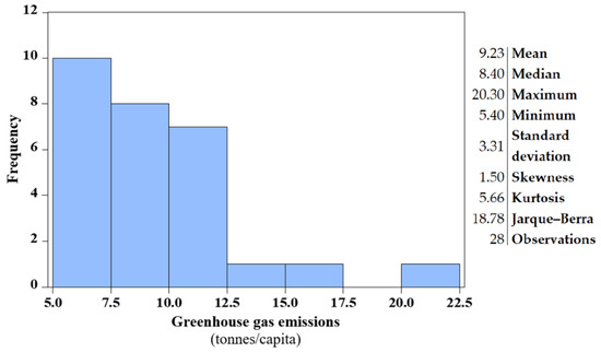 The histogram of greenhouse gas emissions in the EU-28. Descriptive statistics, year 2018. Source: Authors’ own results (raw data source: Eurostat [53], processed in EViews 10 Student Version Lite).