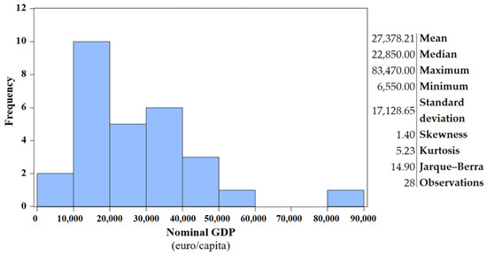 The average nominal GDP in the EU-28 was 27,378.21 euro in 2018, with a standard deviation of 17,128.65—which represents 62.56% of the mean, therefore highlighting discrepancies among the EU-28 members. On the one hand, Luxembourg and Ireland are among the top countries regarding the nominal GDP (83,470 and 57,780 euro) and the greenhouse gas emissions (20.30 and 13.20 tons per capita) and, on the other hand, countries such as Bulgaria (6550 euro per capita) and Romania (8740 euro per capita) are at the bottom of the ranking, deeply affected in terms of the economic power of the individual, even though they are not necessarily generating a lot of greenhouse gas emissions (8.30 tons per capita in the case of Bulgaria and 6.00 in the case of Romania, below the EU-28 average of 9.23 tons per capita). Skewness (1.40), kurtosis (5.23) and Jarque–Bera confirm that this series is not normally distributed, an unfavorable situation from a socio-economic perspective. However, abnormality would be desirable if the distribution was to be negatively skewed and leptokurtic, because then that would signal large numbers of EU members having high values of the nominal GDP and only few countries that would have to catch up.