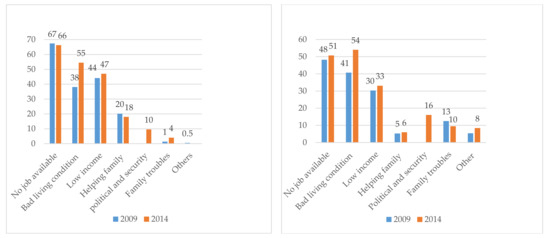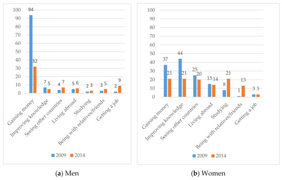 Individuals with higher education are more likely to translate migration intention into actual migration, especially when they have transnational social networks in the desired destination countries [57], and the growth prospects there are favorable [45]. Moreover, cultural and community aspects should be taken into consideration to understand migration intentions. Ruyssen and Salomone examined the causal effects of gender discrimination in the country of origin on women’s desires to migrate over the period 2009–2013 in 148 countries. They found that women’s awareness of existing gender discrimination increases their willingness to migrate [58]. In Lebanon, Dibeh et al. have used a unique dataset from the SAHWA Youth Survey (2016) to examine some of socioeconomic drivers behind the decision of youths to emigrate from Lebanon. They found that youths from the most impoverished regions showed the highest propensity to migrate, while youths with explicit socioeconomic concerns also have a higher willingness to emigrate [59]. However, there was no difference between youth living in rural or urban areas regarding their decisions to emigrate or not.
