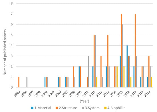 Some papers were conducting research on several topics as shown in the table presented in the Appendix A. The number of papers published in individual years and their research topics is presented in Figure 2. The bar chart shows that the topic “Structure” was relatively frequently discussed, and “Biophilia” seems to be emerging recently in our sample. The trends of papers with the topics of Material and System are similar, still the number of papers with the topic of System is relatively large compared with that of the papers related to Material.
