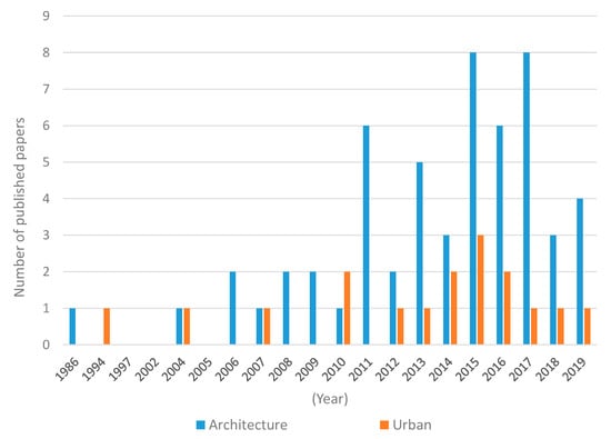 Number of papers published in individual years and target scales (Architecture/Urban).