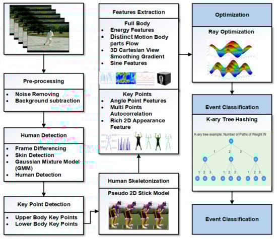 In this section, we describe our proposed methodology to estimate human posture and sustainable event classification (SEC). Initially, the pre-processing phase covered the input of videos, noise removal, and frame sizing tasks. Then, the silhouette extraction, human detection, and human body key points were detected and represented as a pseudo-2D stick model. After that, seven different types of features that belong to two major categories (full-body features and key point features) were extracted. Then, ray optimization was applied to optimize the feature vector. Finally, a K-ary tree hashing classifier was applied for sustainable event classification. Figure 1 presents the complete model of the proposed system (SEC) methodology.