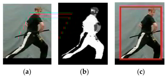 (a) RGB image, (b) human silhouette extraction, and (c) human detection results.