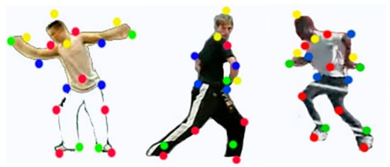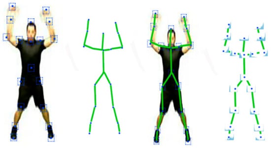 In this section, the human skeletonization [29,30] is considered to be a pseudo-2D stick model. Figure 4 presents a detailed overview of the pre-pseudo-2D stick model which comprises 19 human body key points which in turn comprise 3 main skeleton parts: upper body skeleton (), midpoint (), and lower body skeleton (). is based on the linkage of the head (), neck (), shoulders (), elbow (), wrist (), and hand points (). is based upon the linkage of hips (), knees (), ankle (), and feet ). Each key point takes a specific time t to perform a specific action. Equations (5)–(7) represent the relationships in the pre-pseudo-2D stick model: