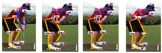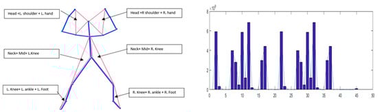 where is denoted as a human 2D-stick model, is the upper limit, is the lower limit, and denotes key points scaling. We used volumetric and kinematic data to allow the skeleton to track the human body key points. We used the size of the human silhouette to calculate the upper and lower distances. Then, frame size, consisting of the height and the width of the frame was estimated. Equation (9) was used to find the head position;