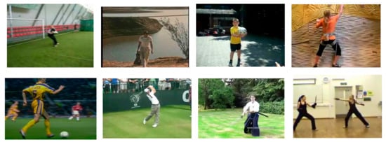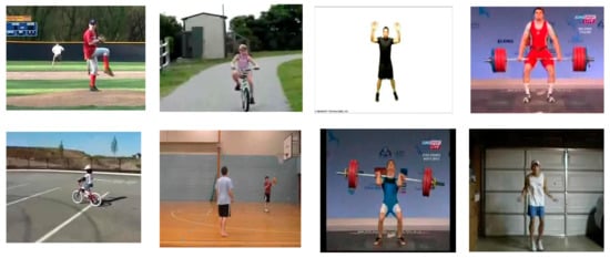 - Kuehne, H.; Jhuang, H.; Garrote, E.; Poggio, T.; Serre, T. HMDB: A large video database for human motion recognition. In Proceedings of the 2011 International Conference on Computer Vision, Barcelona, Spain, 6–13 November 2011; pp. 2556–2563. [Google Scholar] [CrossRef]