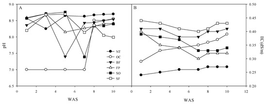 Variations of pH (A) and electrical conductivity (EC) (B) at weeks after storage (WAS) in liquid fertilizers with farm-derived renewable resources used in an experiment plot. NT: Non-treatment, OC: Oil cake, BF: Bone + fish meal, FP: Fish + phosphoric acid, SO: Sesame oil meal, SF: Starfish.