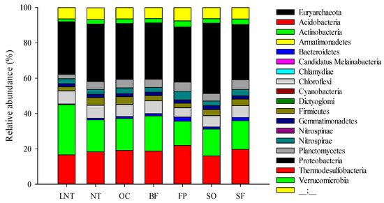Relative abundance of the dominant bacterial phyla as affected by liquid fertilizers. LNT: Long-term non-treatment, NT: Non-treatment, OC: Oil cake, BF: Bone + fish meal, FP: Fish + phosphoric acid, SO: Sesame oil meal, SF: Starfish.