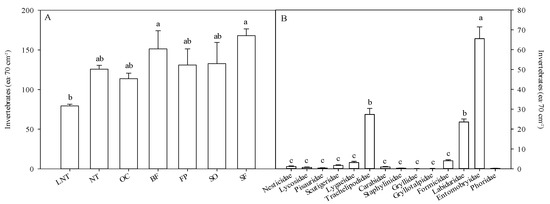 Total number of invertebrates (A) and species of invertebrates (B) as affected by liquid fertilizers. LNT: Long-term non-treatment, NT: Non-treatment, OC: Oil cake, BF: Bone + fish meal, FP: Fish + phosphoric acid, SO: Sesame oil meal, SF: Starfish. Different lower-case letters on each datum point for each phase indicate significant differences as determined by Duncan’s multiple range test at p ≤ 0.05. Bars represent error of the means.