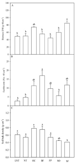 Biomass accumulation (A), number of earthworms (B), and soil bulk density (C) as affected by liquid fertilizers. LNT: Long-term non-treatment, NT: Non-treatment, OC: Oil cake, BF: Bone + fish meal, FP: Fish + phosphoric acid, SO: Sesame oil meal, SF: Starfish. Different lower-case letters on each datum point for each phase indicate significant differences as determined by Duncan’s multiple range test at p ≤ 0.05. Bars represent error of the means.