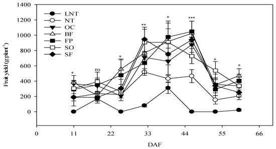 Weekly fruit yield from 11 to 60 days after fertigation (DAF) of liquid fertilizers. LNT: long-term non-treatment, NT: Non-treatment, OC: Oil cake, BF: Bone + fish meal, FP: Fish + phosphoric acid, SO: Sesame oil meal, SF: Starfish. *, **, *** adjacent to each datum point for each sampling time indicate significant differences as determined by Duncan’s multiple range test at p ≤ 0.05, 0.01 or 0.001, respectively; ns, not significantly different.