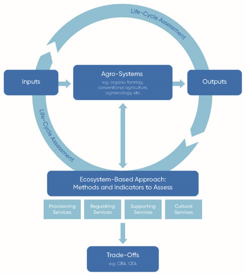 To answer similar questions and to support decision-making, we need to assess the sustainability of agro-systems using scientific evidence. The framework suggested in Figure 1 is an evolution of different research recommendations [6,25]; it integrates an ecosystem-based approach and life-cycle analysis (LCA) for multi-criteria decision-making to provide an adequate tool for assessment of the trade-offs between generated or lost ecosystem services in sustainable agriculture. This framework can be used to determine nutrition inputs for organic farming and in other agro-systems such as conservation agriculture, biodynamic agriculture, and conventional agriculture.