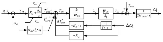 As shown in Figure 1, by establishing the control model of each module, a simplified control model of the DFIG can be obtained. Moreover, Tmax and Tmin are the maximum and minimum reference torques that the speed controller can output. fs is the frequency of the power system [23].