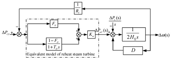 When a transient disturbance occurs in the system, the frequency is dynamically adjusted and restored to a steady-state value under the regulation of synchronous unit and load. The system frequency response process has a relatively long time scale. In order to facilitate calculation, the links with a smaller time scale can be ignored, and the system model can be appropriately simplified. In [24,25,26], a simplified second-order frequency response model is proposed. The system frequency response process only considers the generator rotor and steam turbine reheater with a large inertia time constant [24], as shown in Figure 2. The model assumes that the synchronous generators are all driven by reheat turbines, and all conventional generators in the system are equivalent to one turbine generator. H is the equivalent inertia time constant of synchronous generator set after equivalent calculation. R is the droop coefficient of the governor. TR is the time constant of the turbine reheater. FH is the proportion of the output power of the high-pressure boiler. Km is the mechanical power gain factor. ΔPG is the change in the mechanical power of the generator. ΔPa is the acceleration power assumed by the rotor. ΔPd is the disturbance power. D is the load-damping coefficient.
