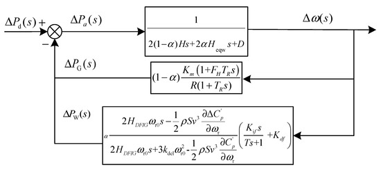 Substituting the parameters of Equation (30) into Figure 2, the modified power system frequency response model, after the wind turbines participating in the frequency regulation control are connected, can be obtained, as shown in Figure 3.