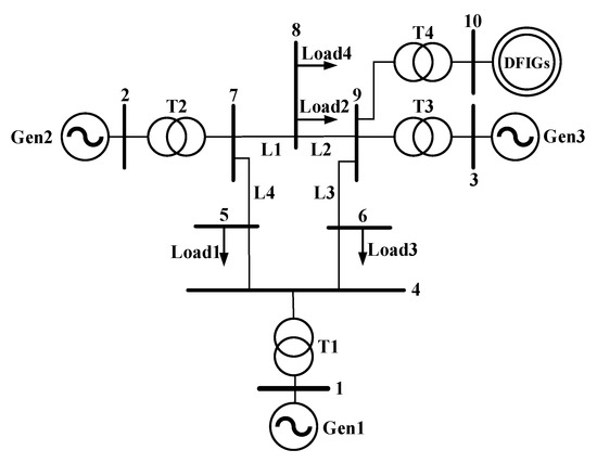 Considering that wind power is connected to the power system, wind power and synchronous generator sets balance the load power together. The grid conditions are basically the same. The system can be set to contain n synchronous generators and m wind turbines. Define the wind generation penetration in the power system α as the ratio of grid-connected wind power capacity to the total installed capacity of the system. That is,