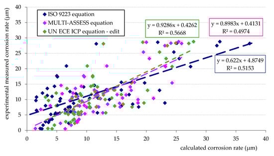 The prediction of annual corrosion losses based on probabilistic methods can be carried out via suitable dose–response functions [,,]. Based on the analysis carried out in this article, the formula listed in EN ISO 9223 and the formula obtained from the extensive experimental Multi-Assess program seem to be the best suited for the prediction [].
