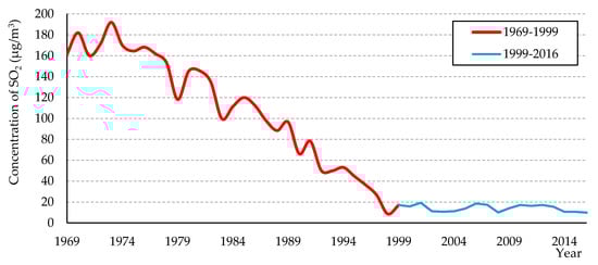 The annual average deposition rate of the concentration of sulfur dioxide in the air experienced a significant change over the past 50 years [,]. Figure 2 displays the monitored long-term deposition rate of sulfur dioxide for the selected site of Kopisty.