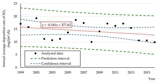Annual average deposition rate of sulfur dioxide after 1998 in locality Kopisty (Czech Republic)—regression analysis and prediction intervals.