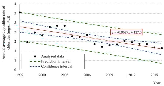 Annual average deposition rate of chlorides in locality Kopisty (Czech Republic)—regression analysis and prediction intervals.
