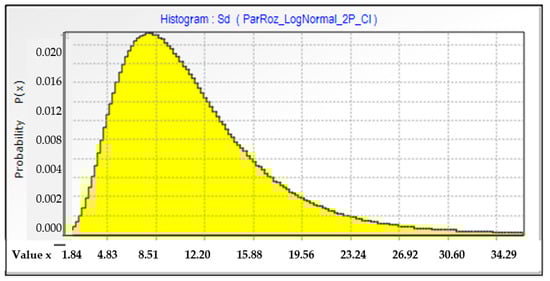 The concentration of sulfur dioxide shown in Figure 2 illustrates a significant change in the average annual values depending on the tracked period. If the values from 1969–1998 were to be included in the prediction model for estimating corrosion loss at the end of the time series, the final predicted value of corrosion loss would have been significantly different. To statistically analyze the data and determine prediction models and the distribution of probability density for the deposition rate of sulfur dioxide, only data points obtained after 1998 were included from the dataset. The course of the linear regression exhibits a slight drop of the mean value, see Figure 3. Figure 4 displays the distribution of the probability density for the end point of the time series (obtained via the HistAn tool []).
