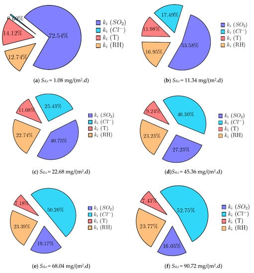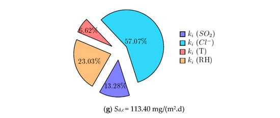 To evaluate the sensitivity of the impact of input environmental parameters on the corrosion rate after 1 year of exposure, a sensitivity factor ki (%) defined by the formula below was used [,]: