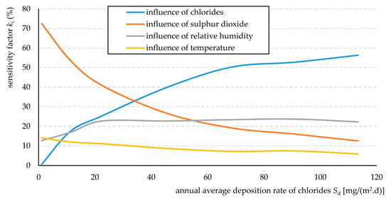 Easier-to-navigate results can be obtained by graphically displaying the values of the sensitivity factor ki for individual investigated parameters depending on the size of the average annual deposition rate of chlorides (Figure 14).