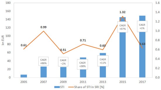 In Europe, as shown in Figure 1, STIs remained at a somewhat low level to 2013, not exceeding 59 billion Euros. STIs grew rapidly between 2013 and 2015 from 59 to 145 billion Euros (+146%), and the compound annual growth rate (CAGR) was 57%. Between 2005 and 2007, CAGR was larger still at 96%, which resulted from low levels of investment in 2005. The assets of themed funds decreased slightly in 2009 (−4% when compared to 2007). In the last period of observation, between 2015 and 2017, total assets increased slightly (+2%). Together with the growth of STI, their share in the sum of SRIs remained at a stable, low level, only exceeding 1% (1.32%) in 2015.