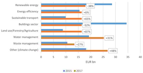 When evaluating specific areas of STI, it is difficult to indicate the dominant ones clearly. In 2015, investors mostly preferred areas such as the building sector and renewable energy (Figure 2), whereas in 2017 investments concentrated mainly on water management and the category labelled “other”, containing investments related to climate change—in these two categories there was a significant increase in investment expenditure (+31% and +48%, respectively, in comparison to 2015). Moreover, investments in land use/forestry/agriculture (+87%) and sustainable transport (+65%) increased significantly. A decline in investments in 2017 was recorded in only two sectors: the building sector (−52%) and renewable energy (−38%), but investments in these areas remained at a relatively high level (over 15 billion Euros).