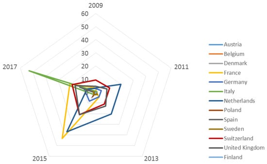 As shown in Table 1 and Figure 3, France, Switzerland, the United Kingdom, and the Netherlands demonstrated the greatest enthusiasm for STIs throughout the analyzed period, which was confirmed by the high value of absolute investments. In 2017, the highest absolute value of assets was measured in France, Italy, Spain, Switzerland, and the UK. In the remaining countries, STIs were at a low level. Italy and Spain only had high levels of STIs in 2017; earlier, from 2009 to 2015, there was a low level of such investments (below 4% in Italy and below 1% in Spain). The dispersion (CV) of European countries with respect to STIs (measured by standard deviation from the average) throughout the period was very high, but in the subsequent periods recorded a slight tendency to decline—with 200% in 2009 and up to 180% in 2017.