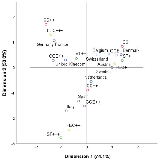 For the purpose of the research, each quantity variable was ascribed to three categories reflecting the level of this phenomenon (low “+”, medium “++”, or high “+++”). Objects (countries) within the same category are close together, while objects in different categories are far apart on the correspondence map. Each object is as close as possible to the category points of categories that apply to the object. In this way, the categories divide the objects into homogeneous subgroups. Variables are considered homogeneous when they classify objects in the same categories into the same subgroups [56]. Variables representing environmental factors for MCA analysis were selected on the basis of two criteria: the substantive evaluation thereof and a significant correlation with sustainability themed investment. Due to the lack of data/lack of investments in 2017, Poland and Finland were excluded from the analysis.