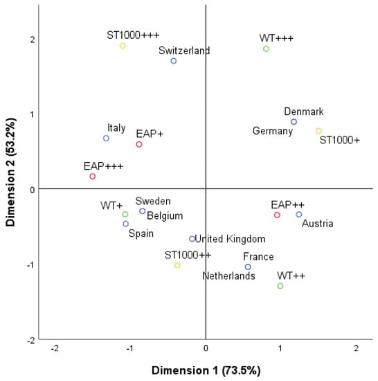 The second diagram (see Figure 5) analyzes exposure to air pollution in terms of the particulate matter (EAP) and waste treatment (WT) variables. The goal was to estimate whether countries with high levels of engagement in financial pro-environmental investments simultaneously have high levels of waste treatment and are less vulnerable to air pollution. In the diagram of the multiple-change correspondence analysis, separate groups of countries with low, average, and high levels of STI/1000, respectively, were presented and variables grouped around them. In this case, due to the hierarchical clustering, four separate groups were formed, which indicates a strong diversification of variable categories. Switzerland is a country with a very high level of STI/1000, whereas Germany and Denmark have the lowest—these two groups share very high waste treatment indicators. Another group included Italy, Belgium, Spain, Sweden, and the United Kingdom—these countries are characterized by a low level of waste processing and high exposure to air pollution, as well as average level of investment per capita. Another group of countries of similar characteristics included Austria, France, and the Netherlands, which had low STI/1000 indicators and average levels of waste treatment and exposure to air pollution by particulate matter.