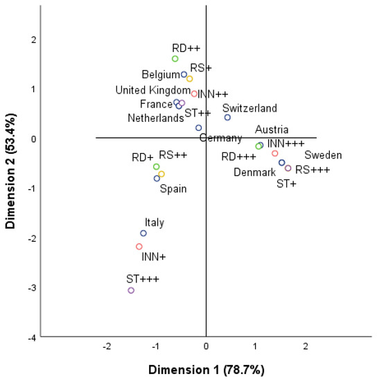 The third diagram (see Figure 6) also analyzes the behavior of countries against variables of nonenvironmental character, however indicating the level of innovativeness in terms of the innovation index (INN), expenditure on research and development (RD), and an environmental variable: share of energy from renewable sources in gross final energy consumption (RS). The goal of such an analysis was to estimate whether countries with high levels of innovativeness and expenditure on R&D use green energy from renewable energy sources. The MCA diagram presents three separate groups obtained due to clustering and the variables grouped around them. The most innovative countries with high expenditure on R&D, using renewable sources of energy, included Austria, Denmark, and Sweden—these countries had the lowest level of STI.