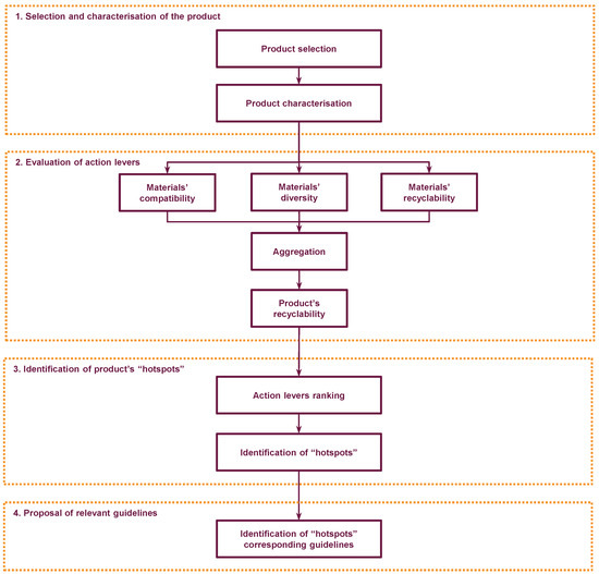 The proposed design-for-recycling approach seeks to allow product designers to identify the product characteristics that are the least efficient in terms of recycling, and to provide the most appropriate guidelines to improve them. It is composed of the four steps listed in Figure 2.