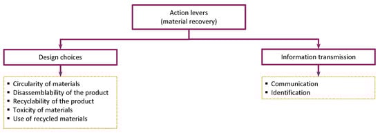 Regulatory constraints have been divided into two categories according to the intended scope. The first one relates to the extent to which the product can be potentially integrated by the recycling chain, and the second one to the (potential) recovery requirements imposed on manufacturers. The identified action levers relate to the following elements: