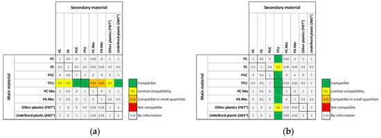 Figure 5. Reading modes of the material’s compatibility matrix: (a) Compatibility as main material; (b) Compatibility as secondary material. * Material selected for the study. - the second mode corresponds to the column reading (Figure 5b). It shows the compatibility of our material as one of the secondary materials (i.e., as an impurity that could compromise the recycling of the main material).