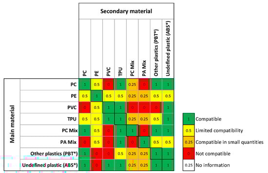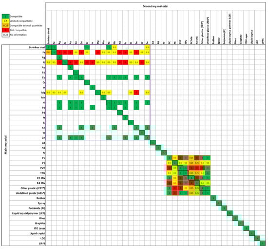 - Ishii et al. [25] propose to assess the compatibility of materials in a semi-qualitative way. The proposed indicator defines six levels of compatibility: very compatible (1), compatible (0.8), some level of compatibility (0.6), incompatible (0.2), hazardous (0), and no information (0.5). The allocated score is within the range [0,1];