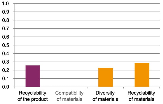 with : recyclability of the product; : compatibility of materials; : diversity of materials; : recyclability of materials; : number of aggregated action levers.