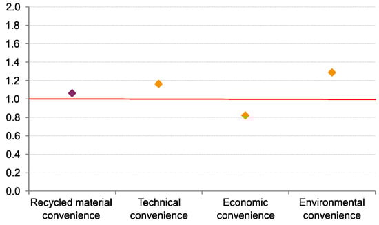 Prior to this study, a value below the reference was expected for the technical convenience indicator due to treatment impurities. For the economic and environmental dimensions, we expected that the use of recycled material would be more convenient than the use of virgin material. This was found not to be true for the environmental dimension and the overall score. The case study made it possible to validate this proposal and to highlight the importance of the joint analysis of the three dimensions. Furthermore, the analysis of a graph such as the one shown in Figure 12 allows the designer to verify quickly the convenience, because anything above the red line (reference value) is not considered to be convenient.