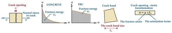 An advanced constitutive model of concrete (3D Nonlinear Cementitious 2) is based on fracture mechanics and the theory of plasticity [68]. The material model chosen for this study is based on the smeared crack concept in tension failure. This problem is shown in Figure 1. The localization of the deformation in the crack band is close to a real discrete crack. Refs [69,70,71] describe the basic idea of the crack band approach, which reduces the sensitivities of the numerical model depending on the size of the finite element mesh [68].