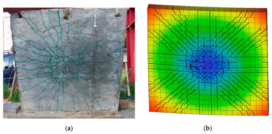 Reinforced concrete slab—underside: (a) after loading test; (b) calculation model with cracks (min. width for plotting cracks—0.2 mm).