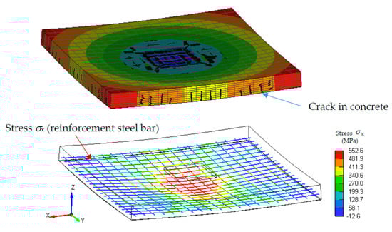 Three-dimensional numerical model of reinforced concrete slab—crack occurrence and stress (Esoil = 22.5 MPa).