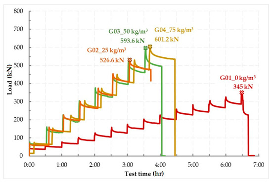 Slabs G02, G03, and G04 were loaded in loading steps of 75 kN/30 min. Slab G01 was made of standard concrete; therefore, smaller loading steps were chosen during loading, that is, 25 kN/30 min. The size of the loading steps can also be seen in Figure 11.