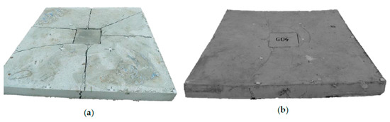 Slabs after load testing: (a) slab G01, without fibers; (b) slab G04, fiber dosage of 75 kg/m3.