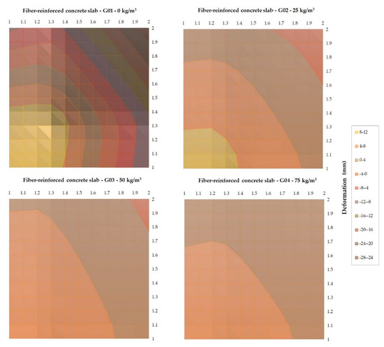 The data from the sensors can be evaluated using two-dimensional graphs or three-dimensional deformation of slabs using contour lines. A variant of the three-dimensional deformation for a load step of 300 kN was processed and is shown for one-quarter of each slab in Figure 14. The lower left edge of each image indicates the center of the slab. Data from the three-dimensional deformation were then used for the load–displacement diagrams in Figure 15.