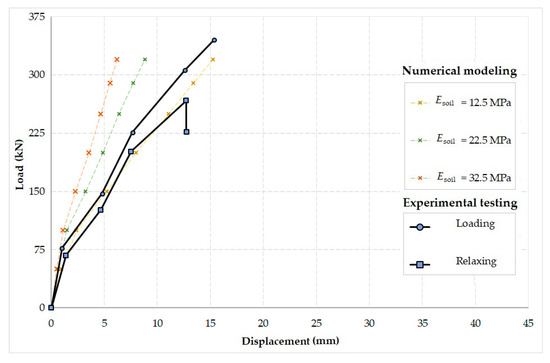 Prior to the experimental load tests, geotechnical tests were performed, which served to obtain the material properties of the homogenized subsoil. The soil was classified as Cl, clay with medium plasticity [76]. The deformation modulus of the subsoil (12.5 MPa) was obtained from the static load test, which was used as an input value for the numerical analyses. The subsoil cohesion value (c = 9.0 kPa) and the angle of internal friction (φ = 19.3°) were determined by a box shear test.