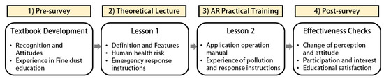 This study provided fine dust environmental education to 182 first-year high school students in Seoul, as shown in Figure 1. Two hours of theoretical classes were conducted to provide knowledge and information on fine dust. A week later, another class was held for the same target students using fine dust educational contents with augmented reality (AR) technology. Surveys were conducted before and after the fine dust education to investigate changes in students’ awareness and attitudes.