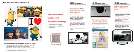 The specific method of performing fine dust education using AR consisted of two stages: In the first phase, students were trained on the basic operation of the application before the official lesson to better understand AR technology. As an example of AR technology implementation, a magical newspaper with moving images in the widely known movie “Harry Potter” was presented to draw the students’ interest. Afterward, students practiced the method of direct manipulation. They registered pictures or letters that they created as markers and used the camera to recognize the markers in the application, which were displayed as animated characters singing in three dimensions. The subtopics covered in the second phase were the inflow of fine dust into the human body, the route and risk to each body organ, the duration from inflow to discharge, and the principle of removing fine dust using artificial rainfall technology. Each topic was developed with a short educational video of 1 to 5 min, and each video’s thumbnail (representative image of the video) was preregistered as a marker. When the camera recognized the marker, the video was overlaid onto the image through the display screen. Additionally, flexible and self-directed learning was encouraged in consideration of each student’s progress rate and interest by providing learning tools and materials that could be used autonomously. Figure 3 shows the learning materials used in the class.